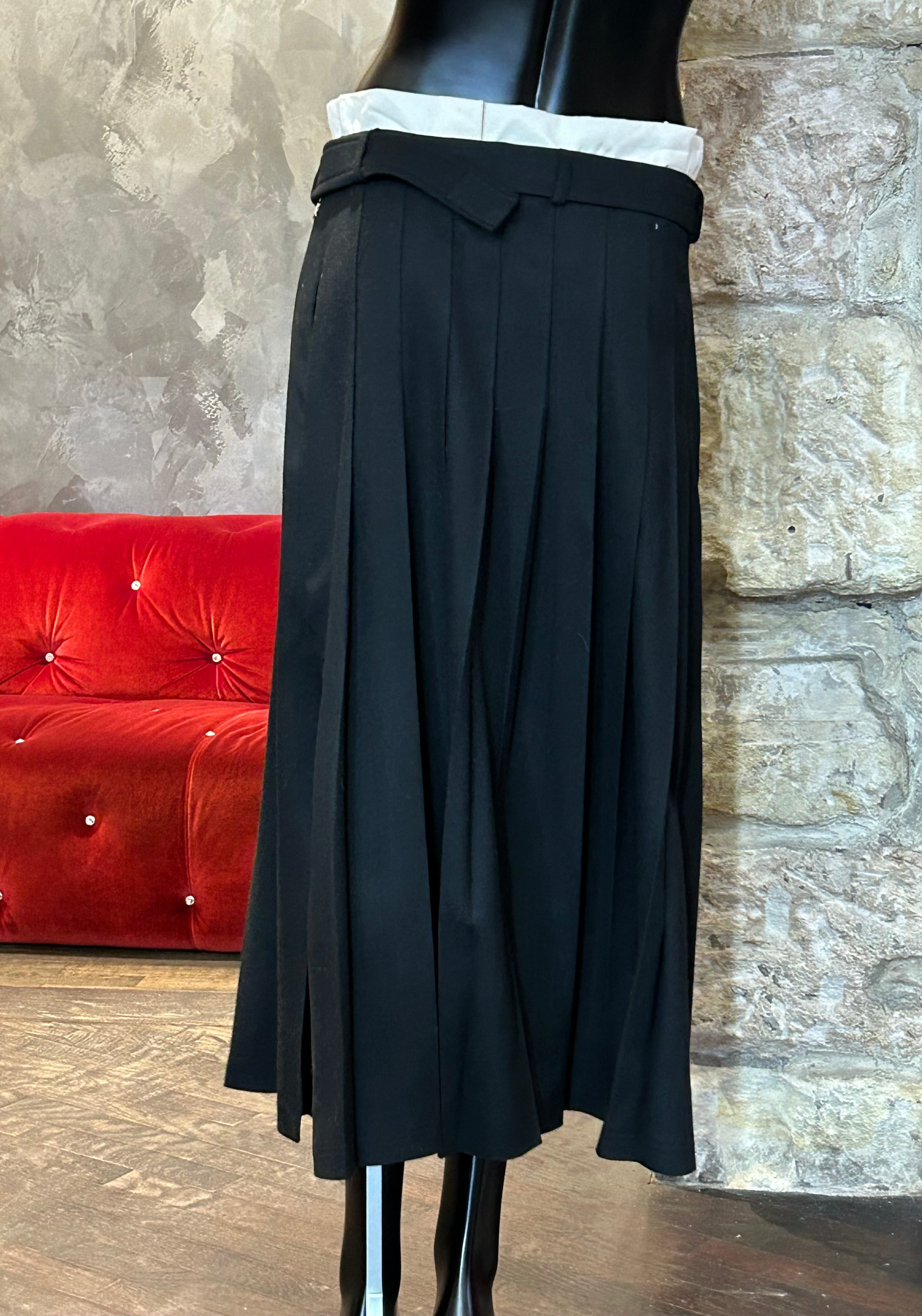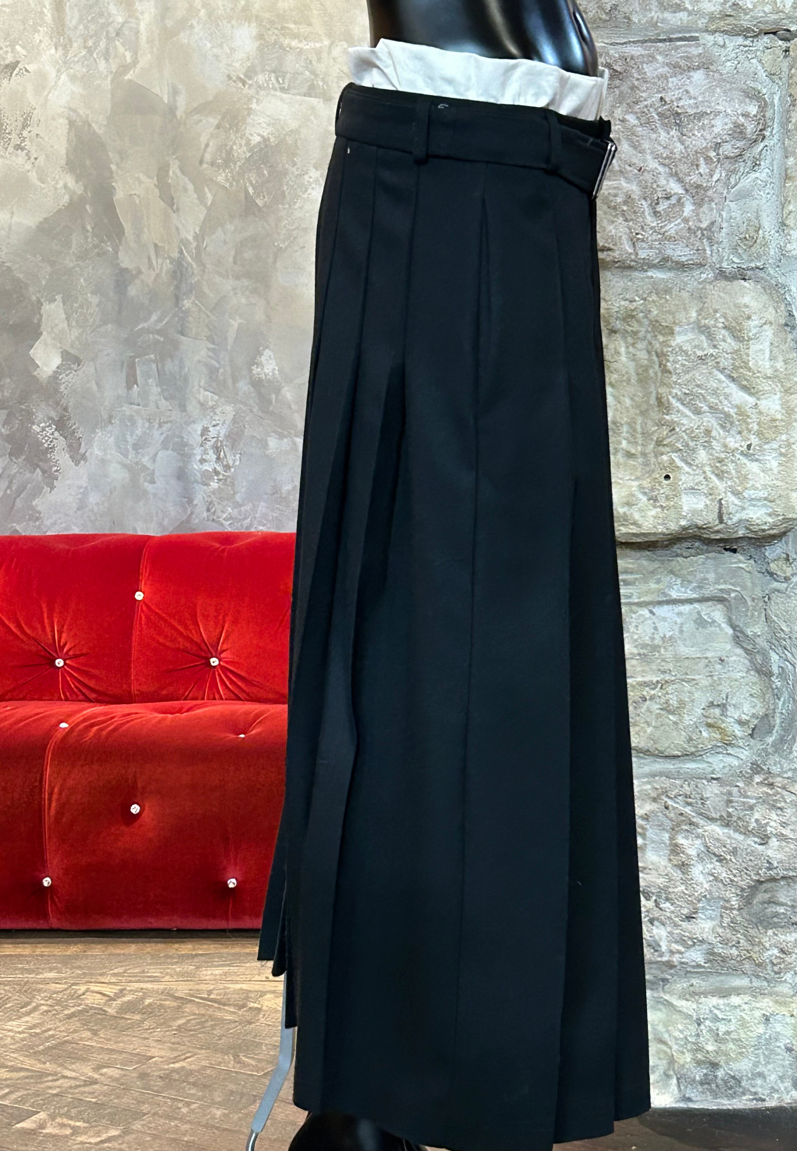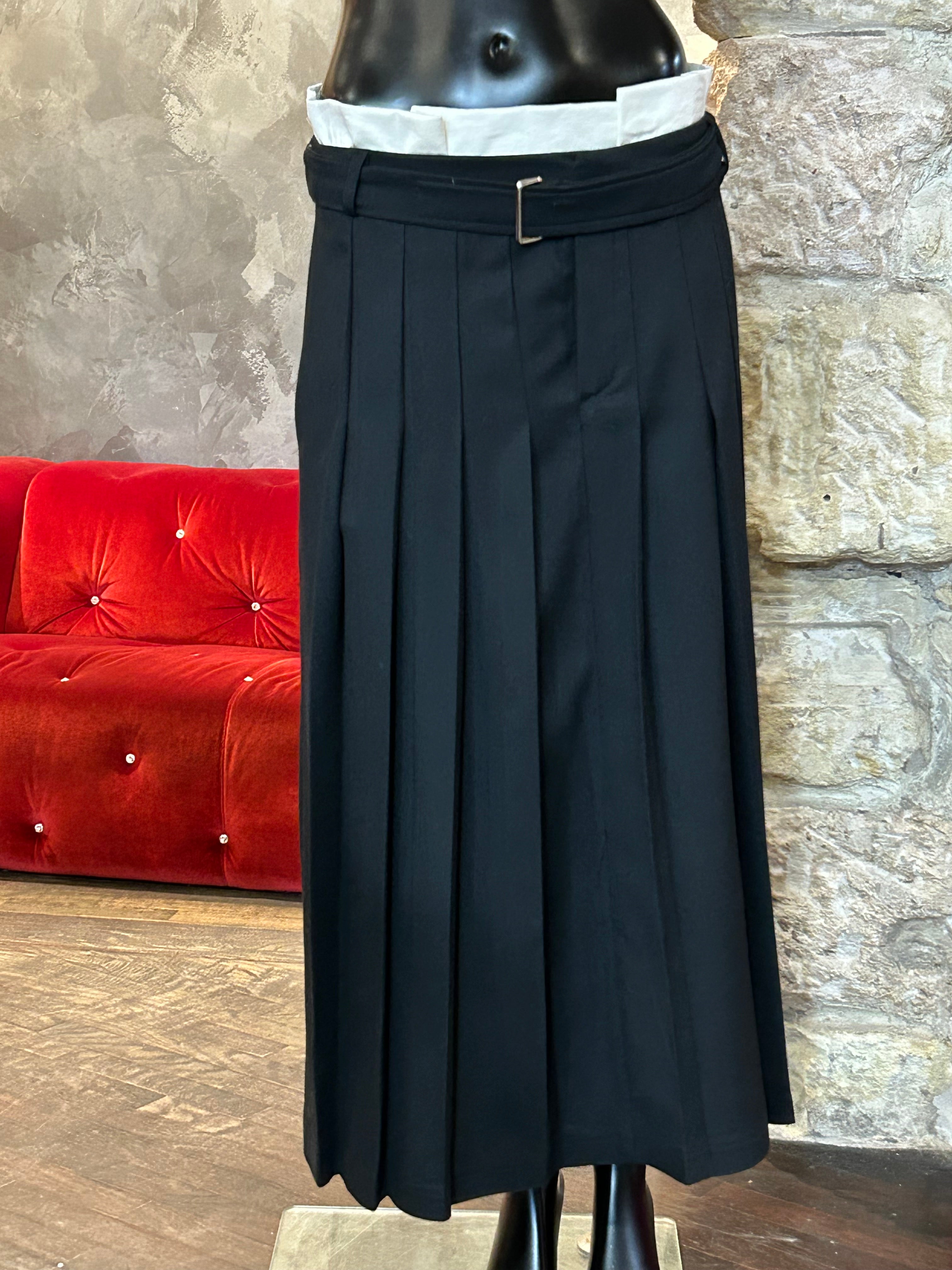 Jupe longue à plis plats et taille basse avec dépassement écru à la ceinture. Une jupe hyper lookée , parfaite avec des bikers ou rangers.