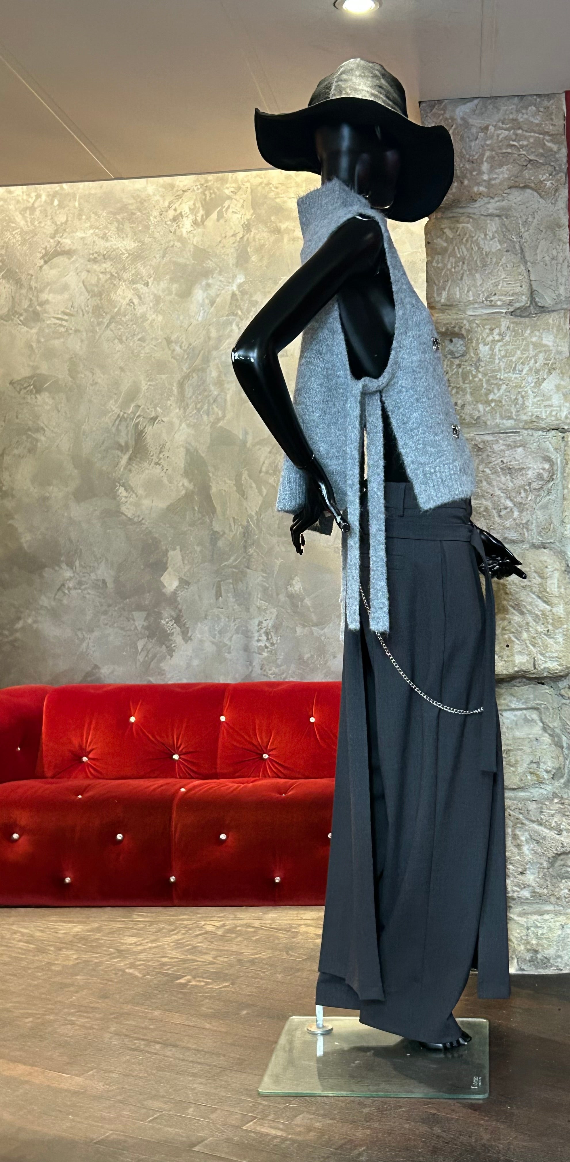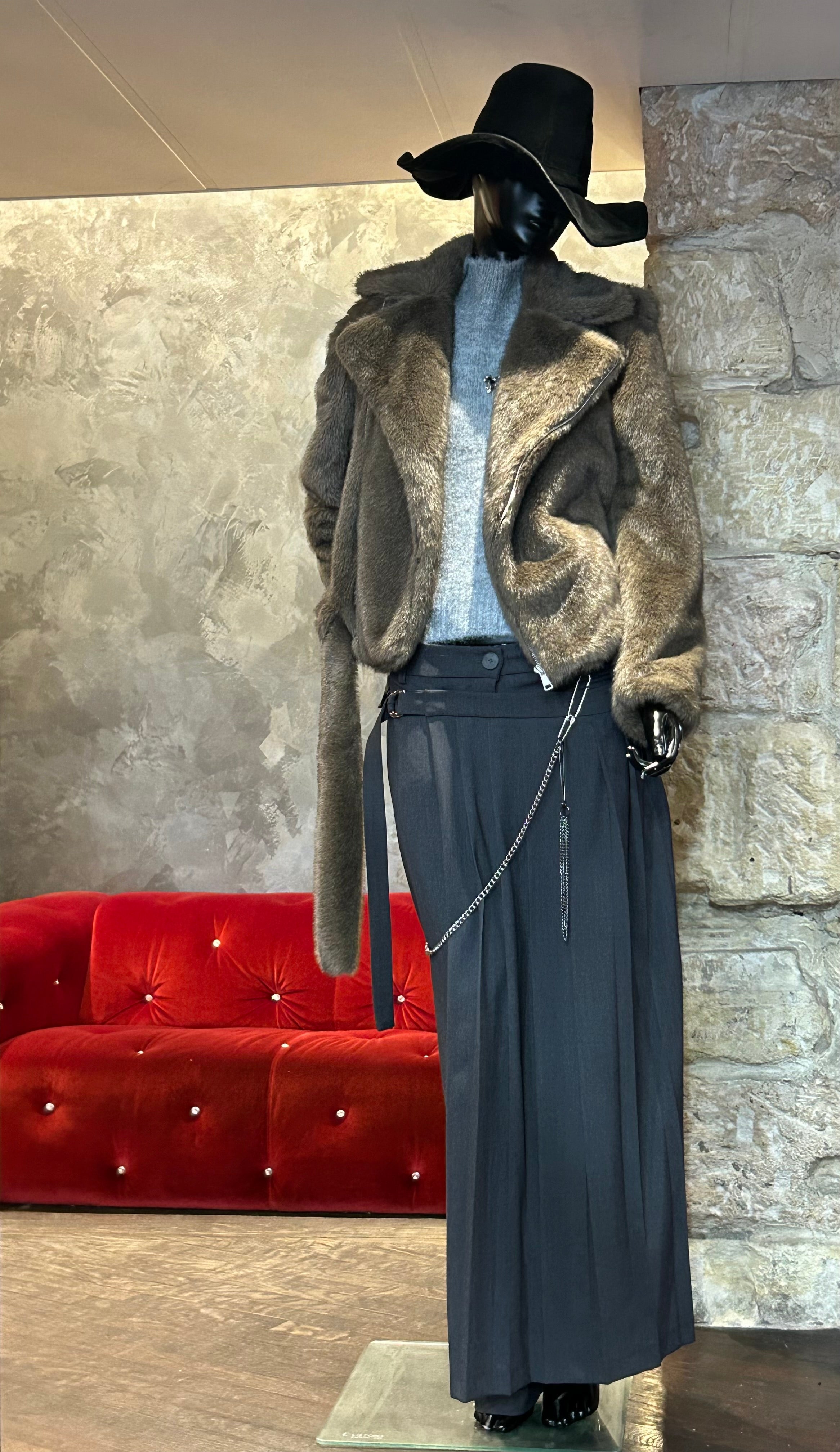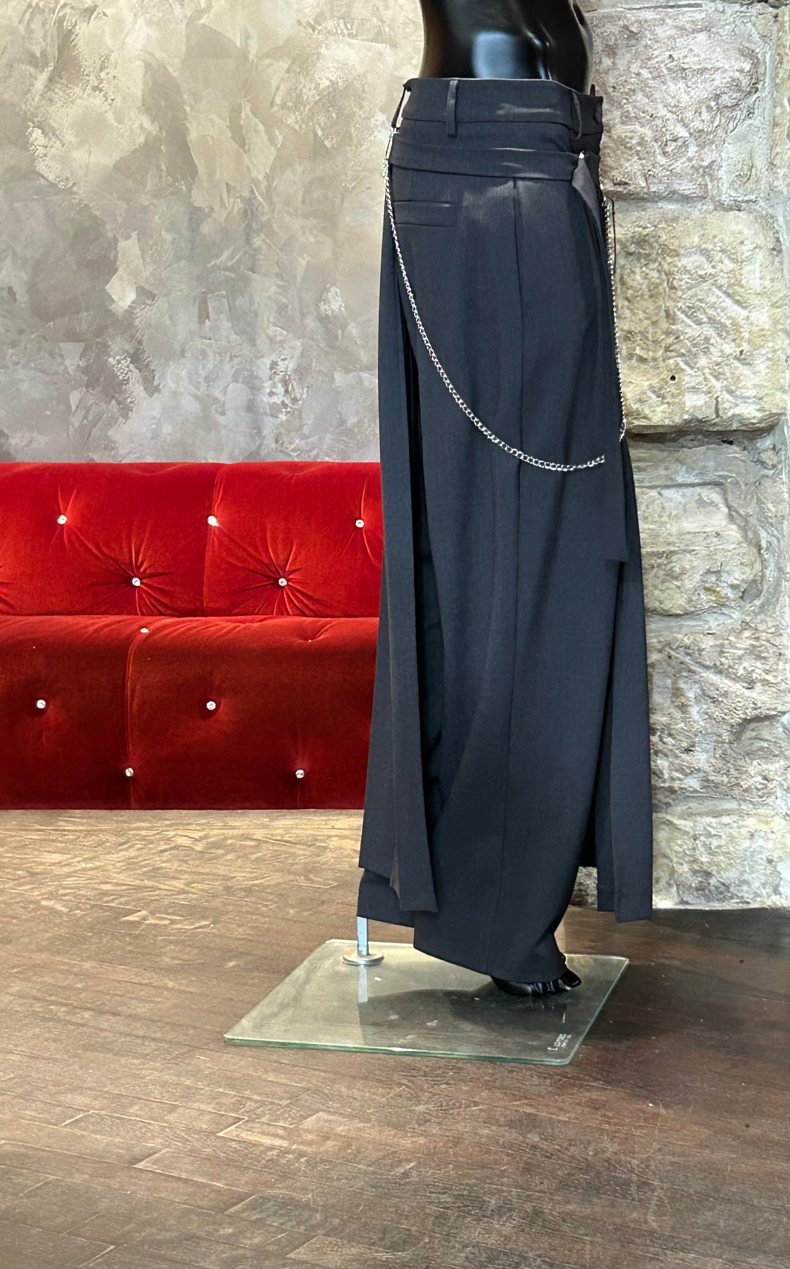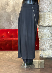 Pantalon avec comme une jupe plissée venant sur les 3/4 en taille décalée et avec une chaîne.