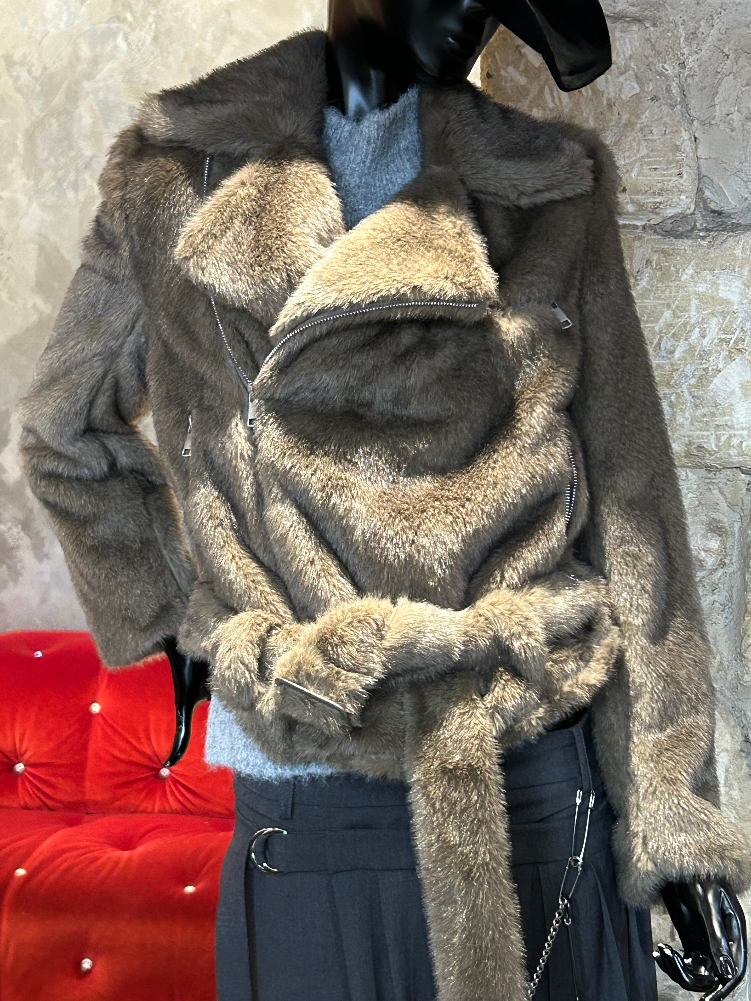Tout comme le perfecto classique, il a des petites épaulettes de fourrure, un zip en biais et une ceinture en fausse fourrure.